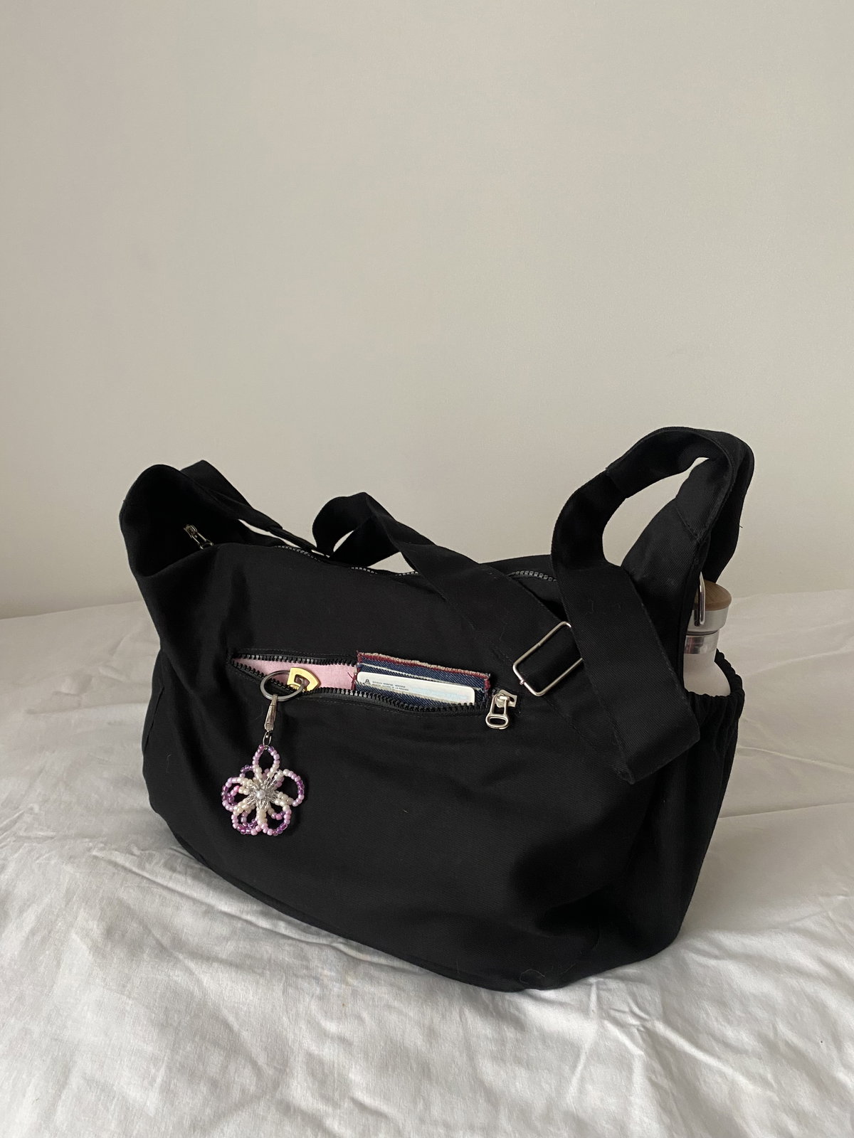 Tiene correa regulable para usarla cruzada o al hombro. Cuenta con dos bolsillos internos, un bolsillo externo con cierre y bolsillo externo con elastico, para mantener tus cosas organizadas.